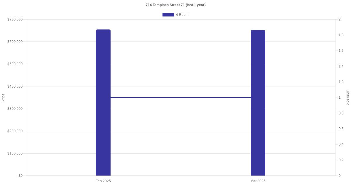 | Feb 2025 | $655,000 | $6,550 | 4 Room | Blk 714 Tampines Street 71 4 Room / 100 sqm | 10 to 12 | 100 sqm | Model A | 1997 |