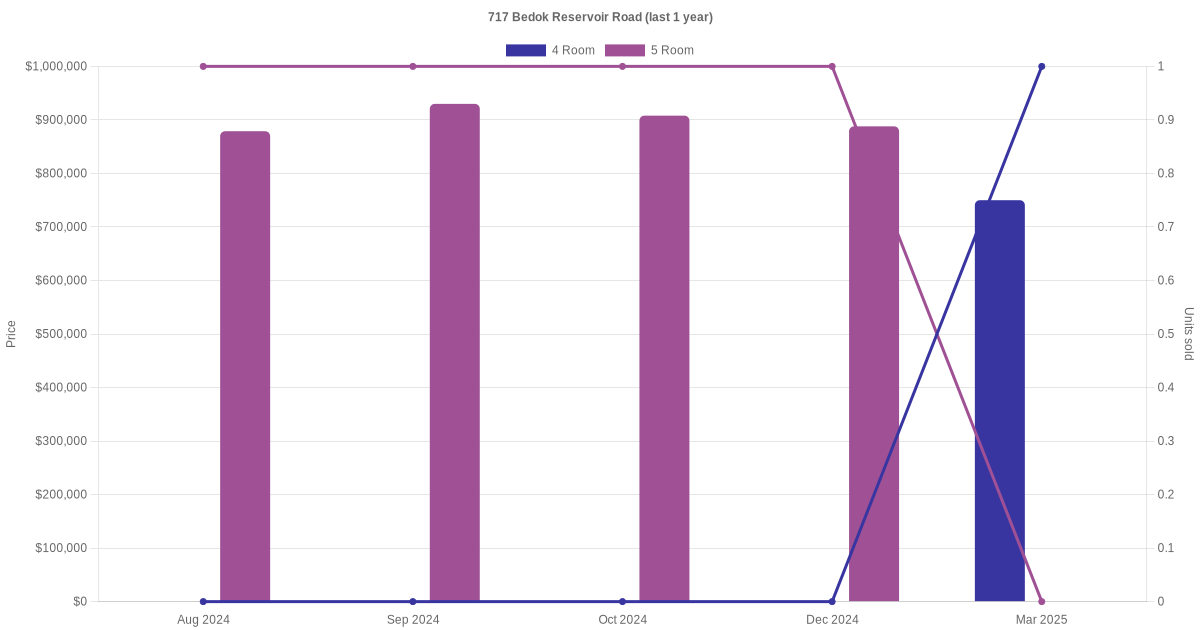 Below is a quick summary of the resale transactions volume and average price trends for the 4 room and 5 room units at 717 Bedok Reservoir Road.