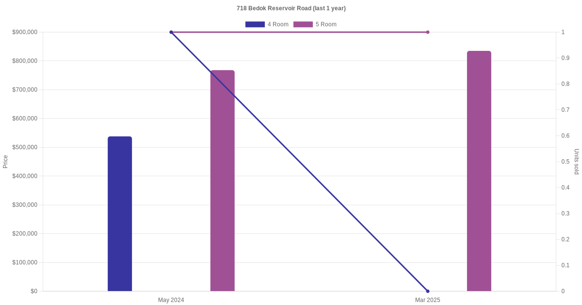 Below is a quick summary of the resale transactions volume and average price trends for the 4 room and 5 room units at 718 Bedok Reservoir Road.