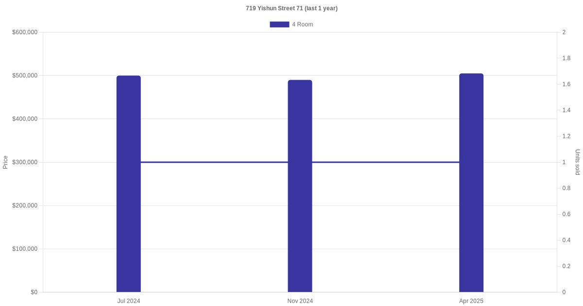 | Apr 2025 | $505,000 | $5,674 | 4 Room | Blk 719 Yishun Street 71 4 Room / 89 sqm | 01 to 03 | 89 sqm | Simplified | 1987 |