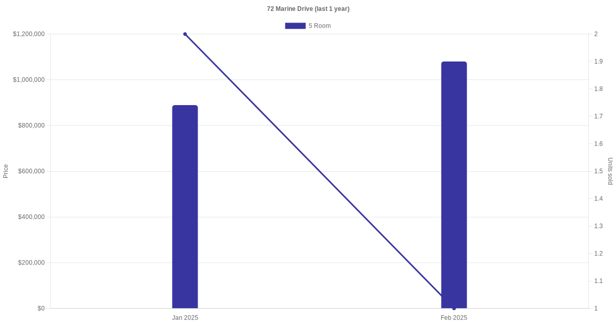 Below is a quick summary of the resale transactions volume and average price trends for the 5 room units at 72 Marine Drive.