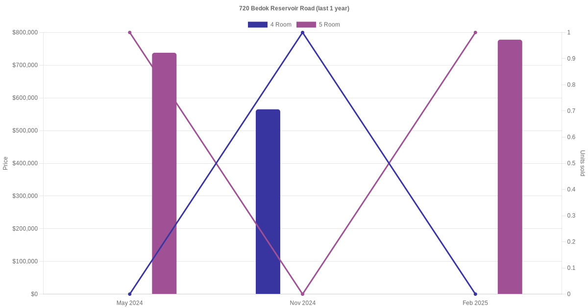 Below is a quick summary of the resale transactions volume and average price trends for the 4 room and 5 room units at 720 Bedok Reservoir Road.