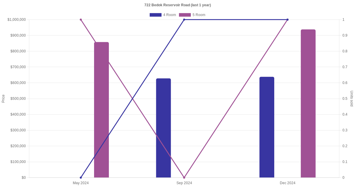 Below is a quick summary of the resale transactions volume and average price trends for the 4 room and 5 room units at 722 Bedok Reservoir Road.