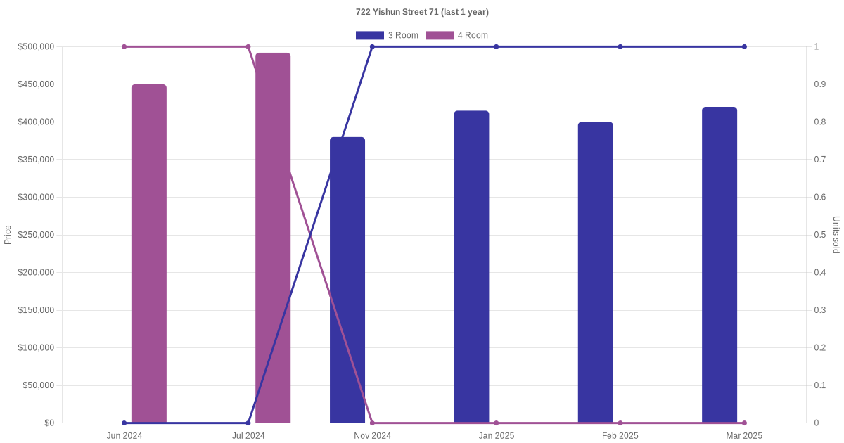 Below is a quick summary of the resale transactions volume and average price trends for the 3 room and 4 room units at 722 Yishun Street 71.