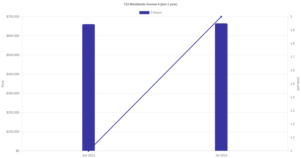 Below is a quick summary of the resale transactions volume and average price trends for the 4 room and 5 room units at 724 Woodlands Avenue 6.