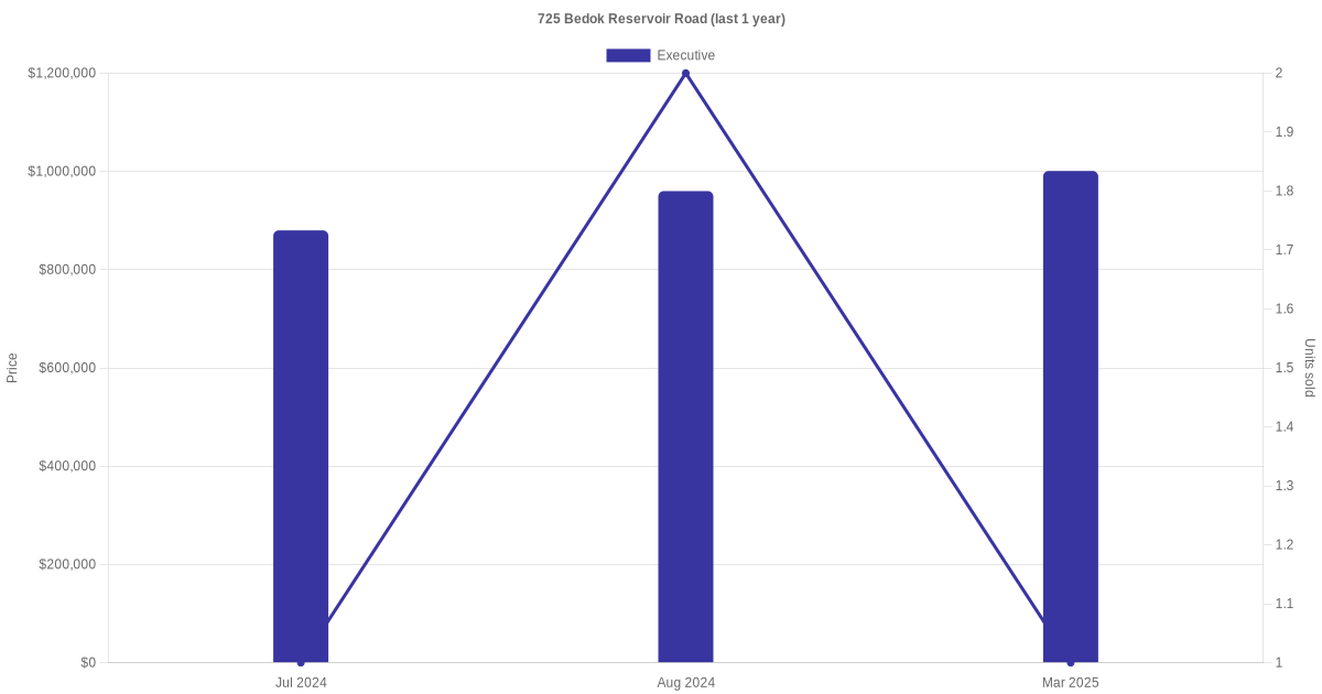 Below is a quick summary of the resale transactions volume and average price trends for the executive units at 725 Bedok Reservoir Road.