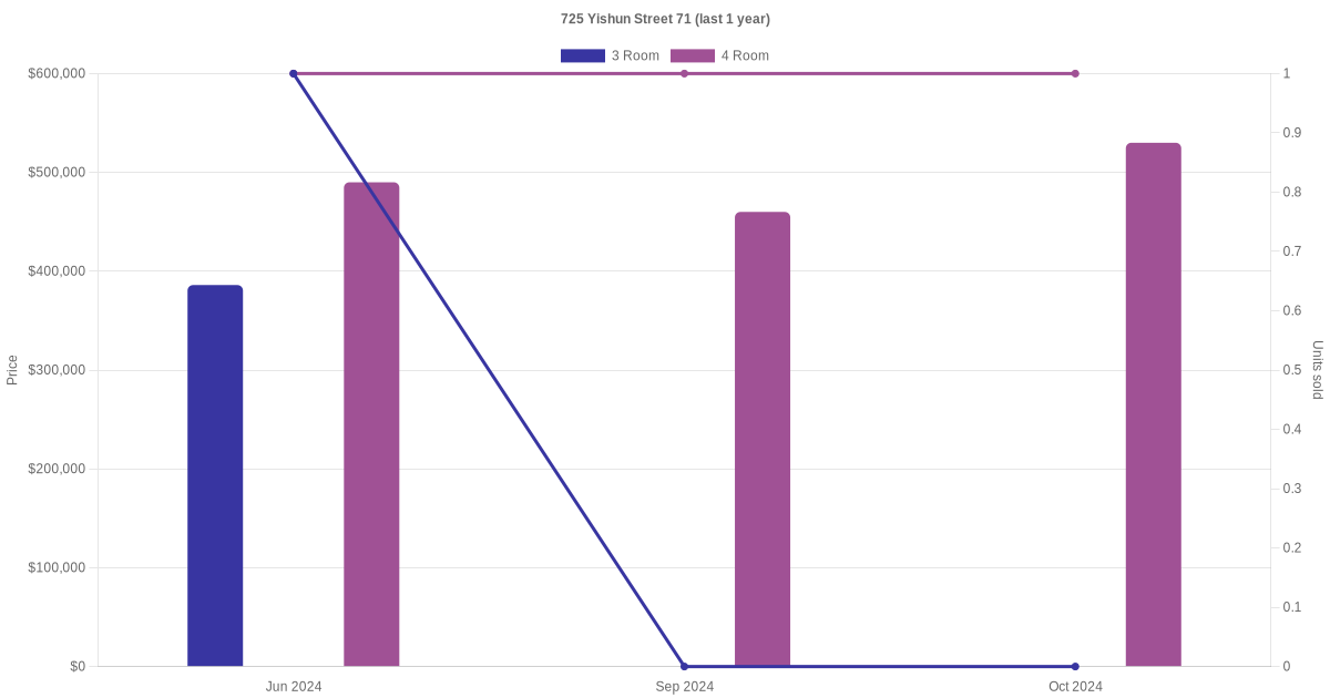 Below is a quick summary of the resale transactions volume and average price trends for the 3 room and 4 room units at 725 Yishun Street 71.