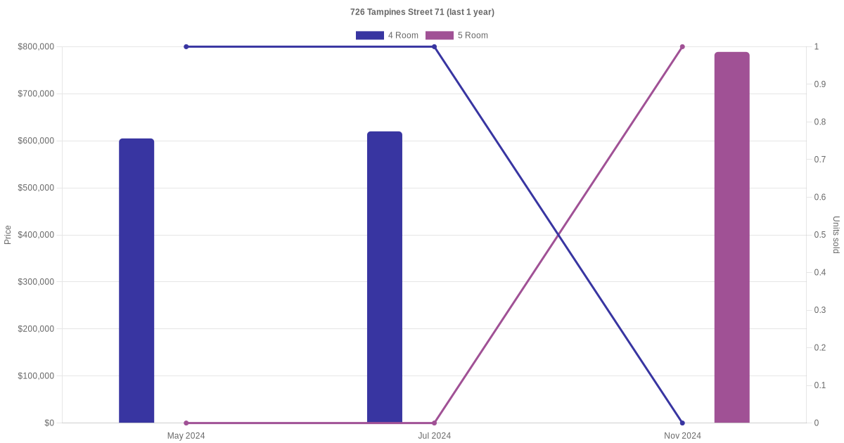 Below is a quick summary of the resale transactions volume and average price trends for the 4 room and 5 room units at 726 Tampines Street 71.