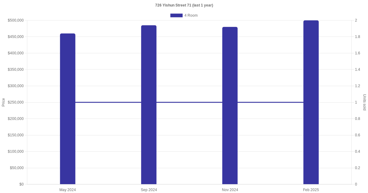 Below is a quick summary of the resale transactions volume and average price trends for the 4 room units at 726 Yishun Street 71.