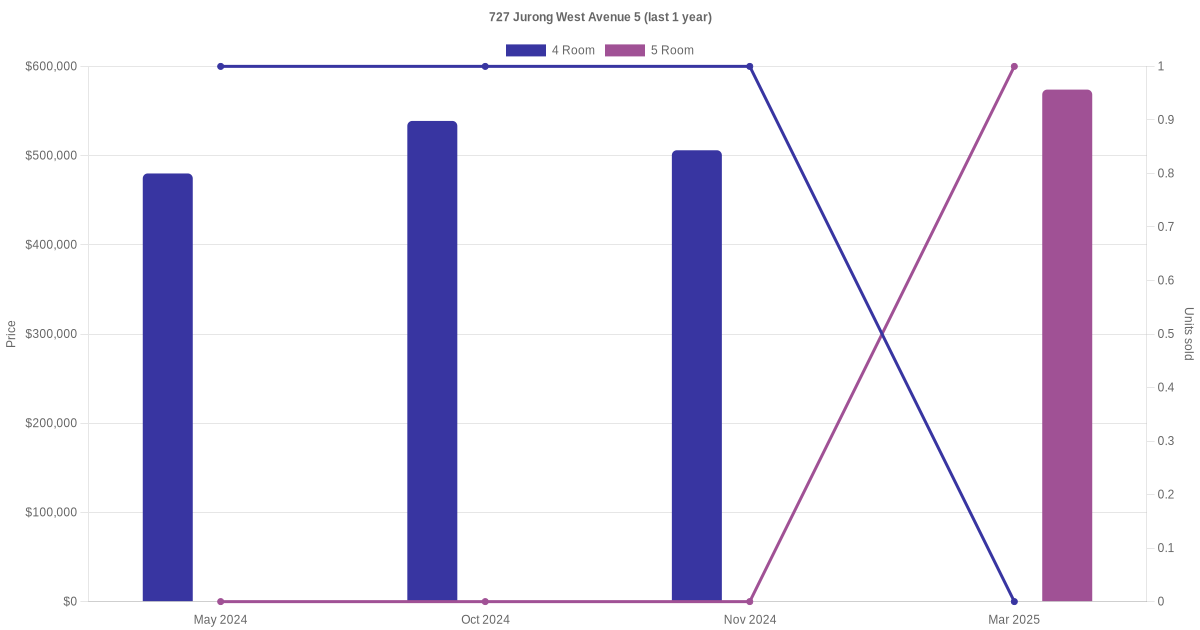 Below is a quick summary of the resale transactions volume and average price trends for the 4 room and 5 room units at 727 Jurong West Avenue 5.