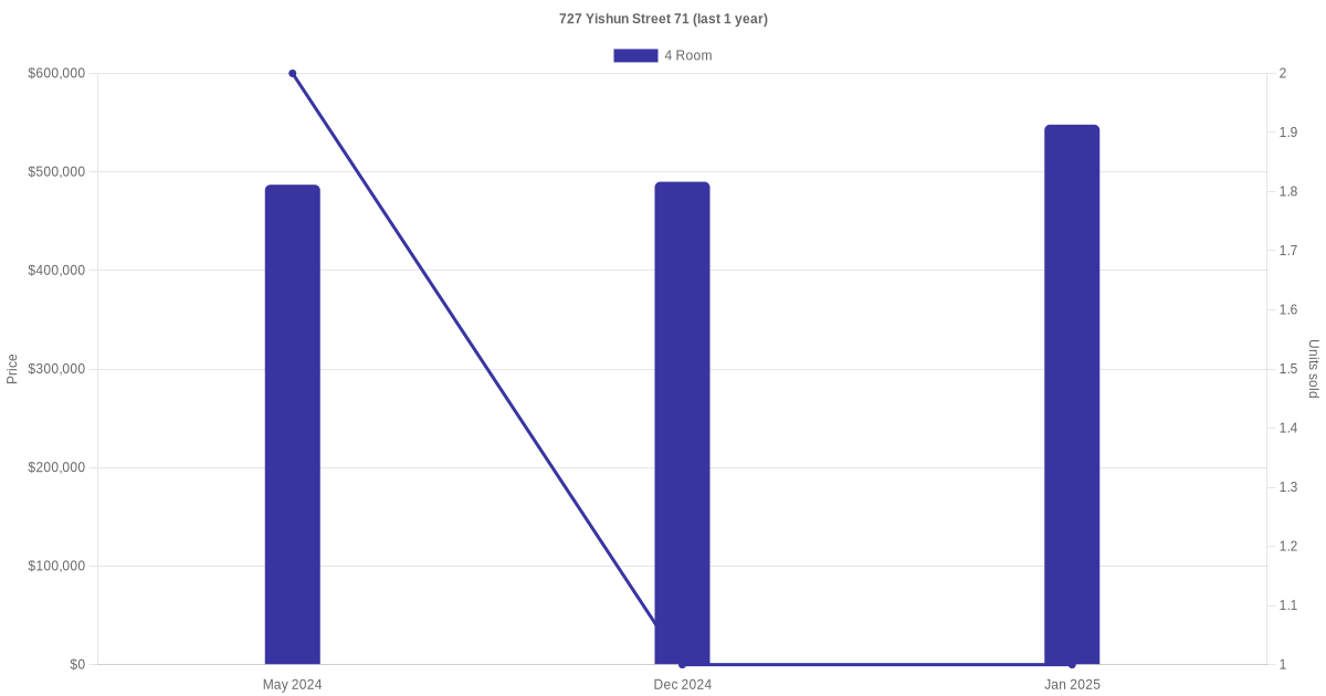 Below is a quick summary of the resale transactions volume and average price trends for the 4 room units at 727 Yishun Street 71.