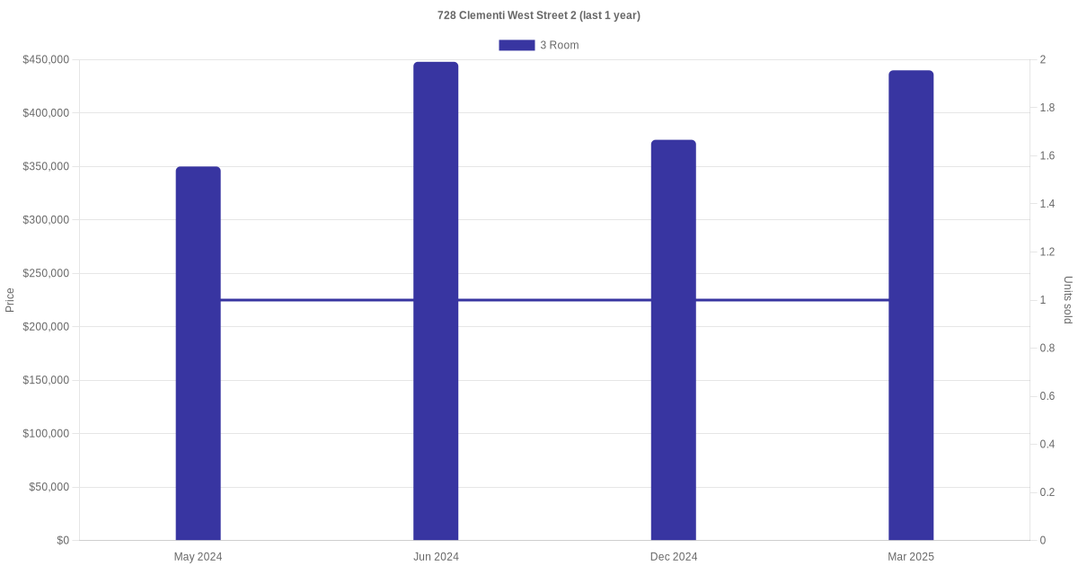 There were a total of 13 resale transactions in the last 3 years for units in block 728 Clementi West Street 2, with the latest one recorded in Sep 2025.