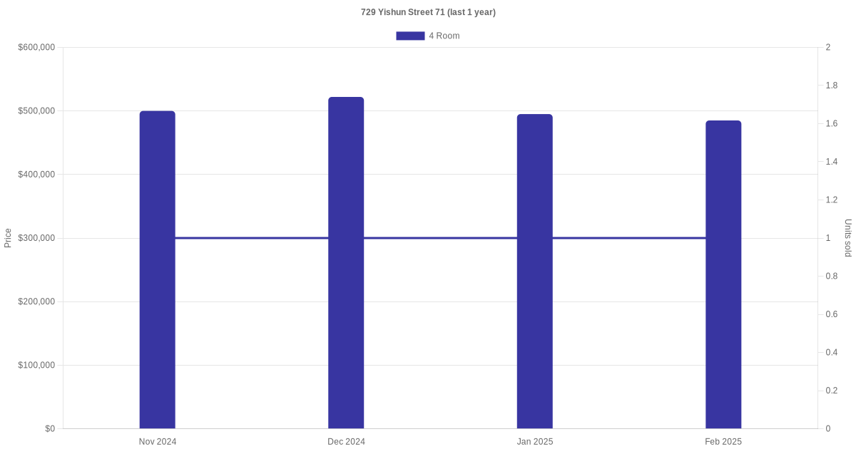 | Apr 2025 | $3,400 | 4 Room | Blk 729 Yishun Street 71 4 Room | Yishun |