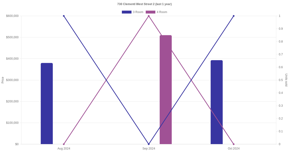 Below is a quick summary of the resale transactions volume and average price trends for the 3 room and 4 room units at 730 Clementi West Street 2.