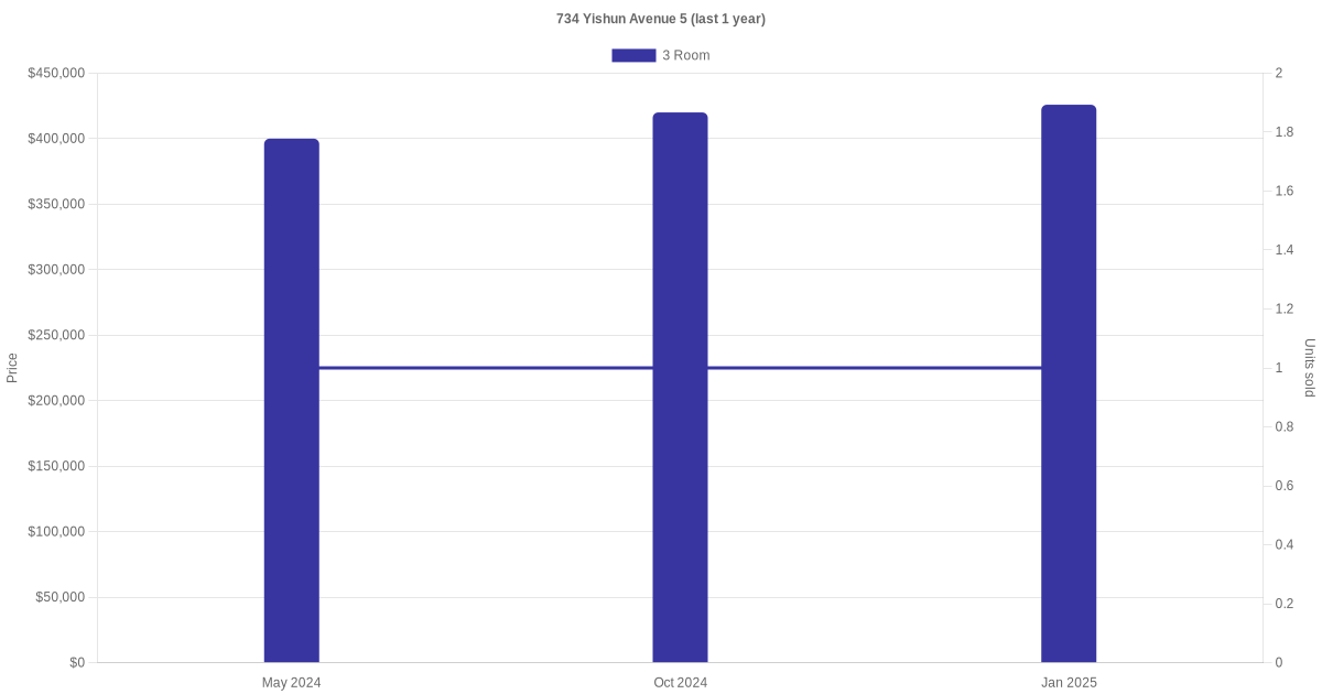 Below is a quick summary of the resale transactions volume and average price trends for the 3 room units at 734 Yishun Avenue 5.
