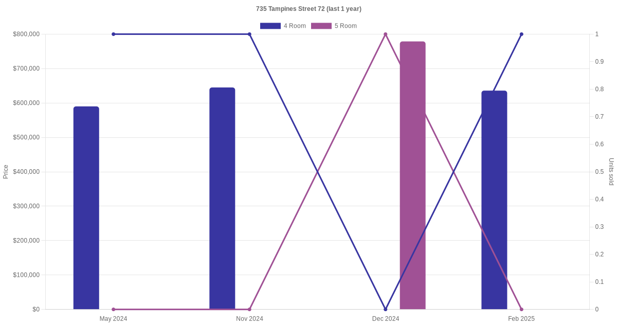 Below is a quick summary of the resale transactions volume and average price trends for the 4 room and 5 room units at 735 Tampines Street 72.