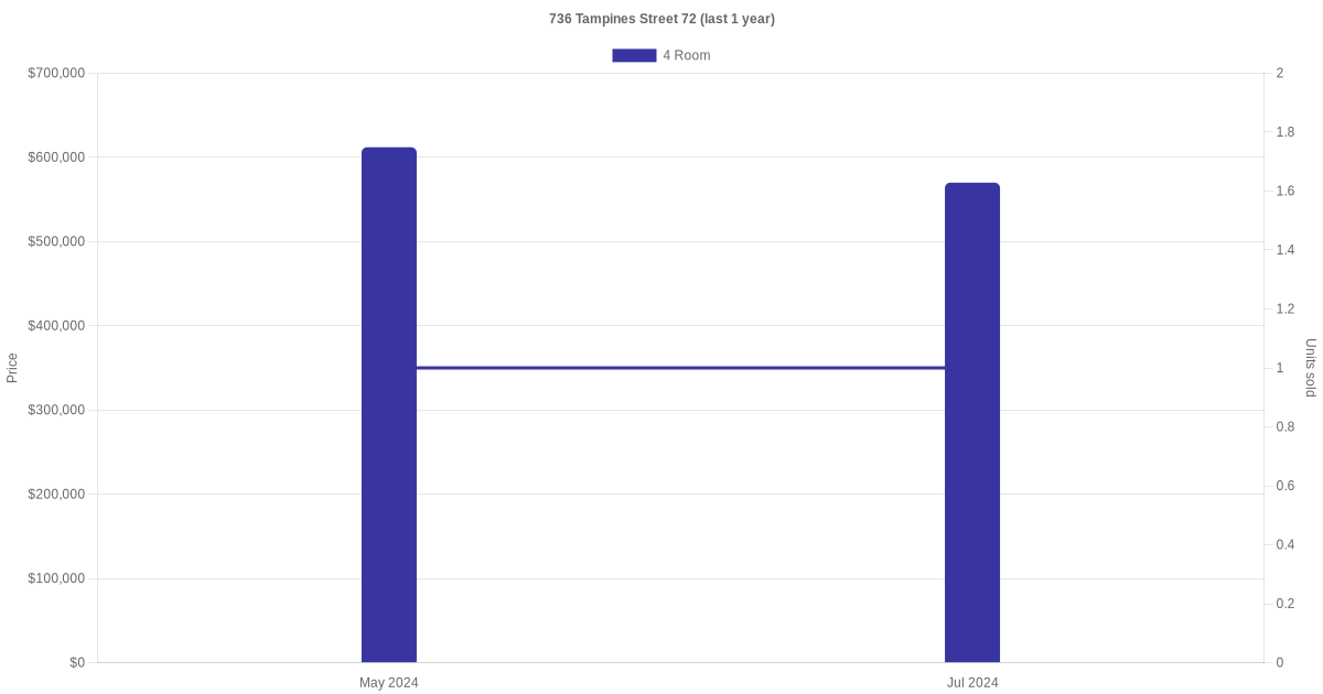 There were a total of 5 resale transactions in the last 3 years for units in block 736 Tampines Street 72, with the latest one recorded in Jul 2024.