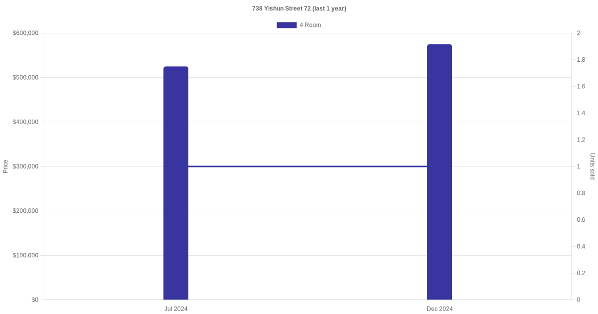 Below is a quick summary of the resale transactions volume and average price trends for the 4 room units at 738 Yishun Street 72.