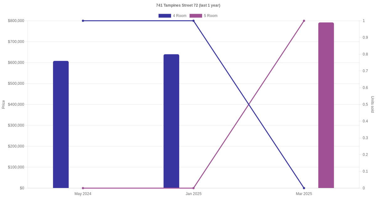 Below is a quick summary of the resale transactions volume and average price trends for the 4 room and 5 room units at 741 Tampines Street 72.