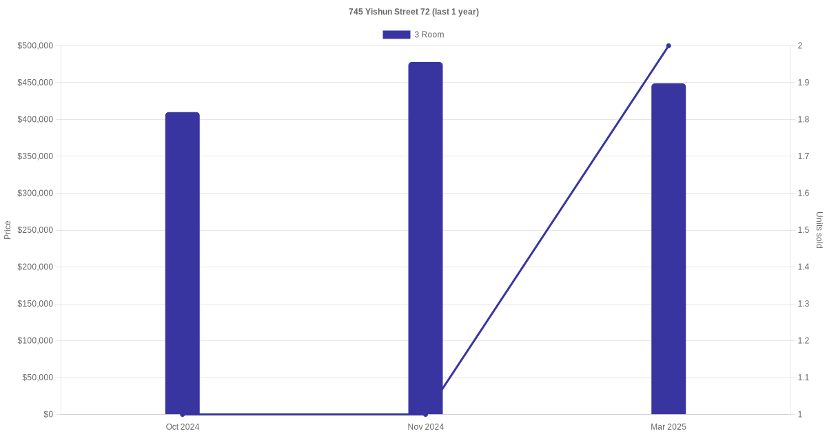 | Mar 2025 | $2,400 | 3 Room | Blk 745 Yishun Street 72 3 Room | Yishun |