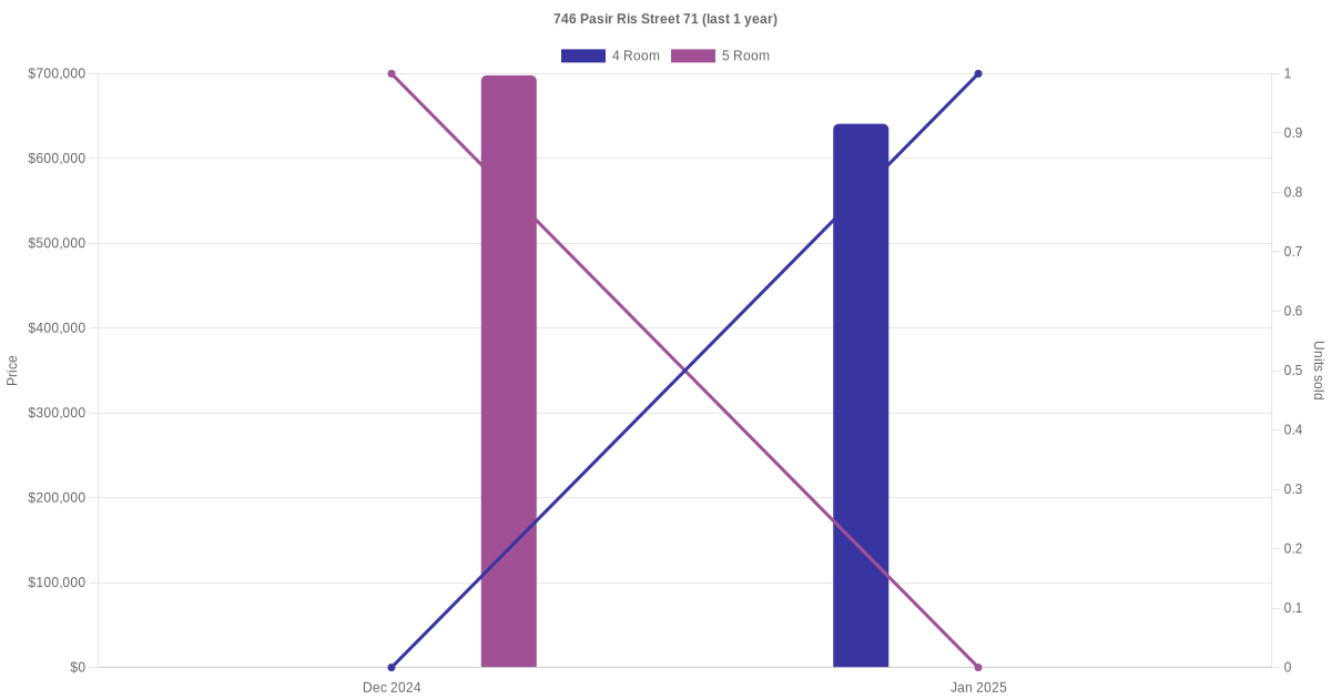 Below is a quick summary of the resale transactions volume and average price trends for the 4 room and 5 room units at 746 Pasir Ris Street 71.