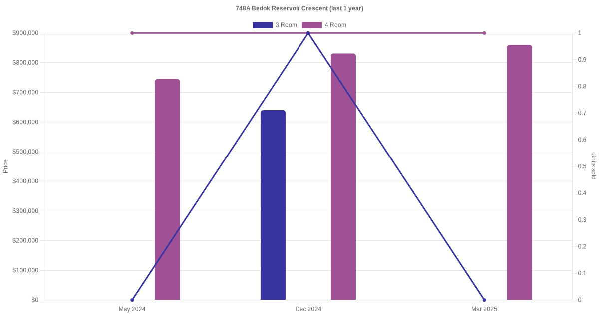 | Aug 2025 | $832,000 | $9,563 | 4 Room | Blk 748A Bedok Reservoir Crescent 4 Room / 87 sqm | 04 to 06 | 87 sqm | DBSS | 2014 |