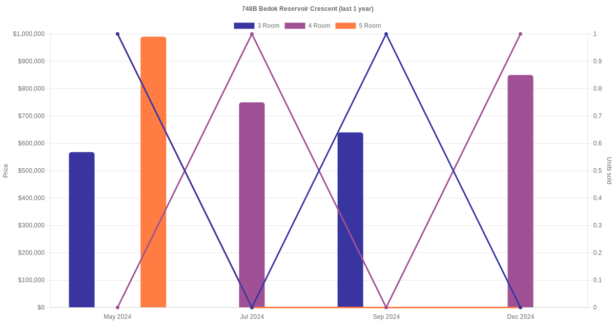 Below is a quick summary of the resale transactions volume and average price trends for the 3 room, 4 room and 5 room units at 748B Bedok Reservoir Crescent.