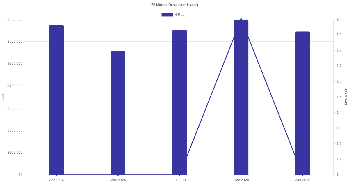 Below is a quick summary of the resale transactions volume and average price trends for the 4 room units at 75 Marine Drive.