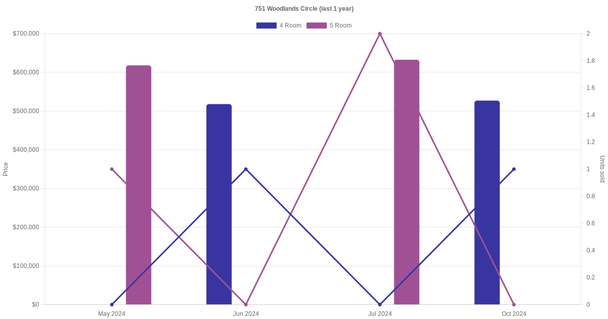 Below is a quick summary of the resale transactions volume and average price trends for the 4 room and 5 room units at 751 Woodlands Circle.