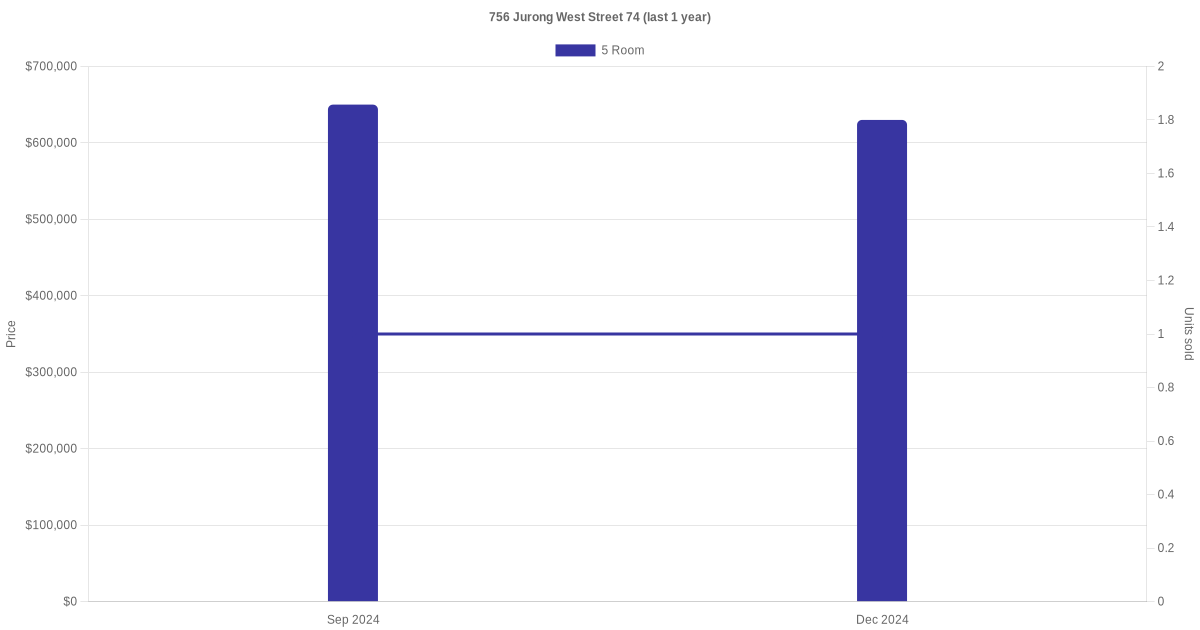 Below is a quick summary of the resale transactions volume and average price trends for the 5 room units at 756 Jurong West Street 74.