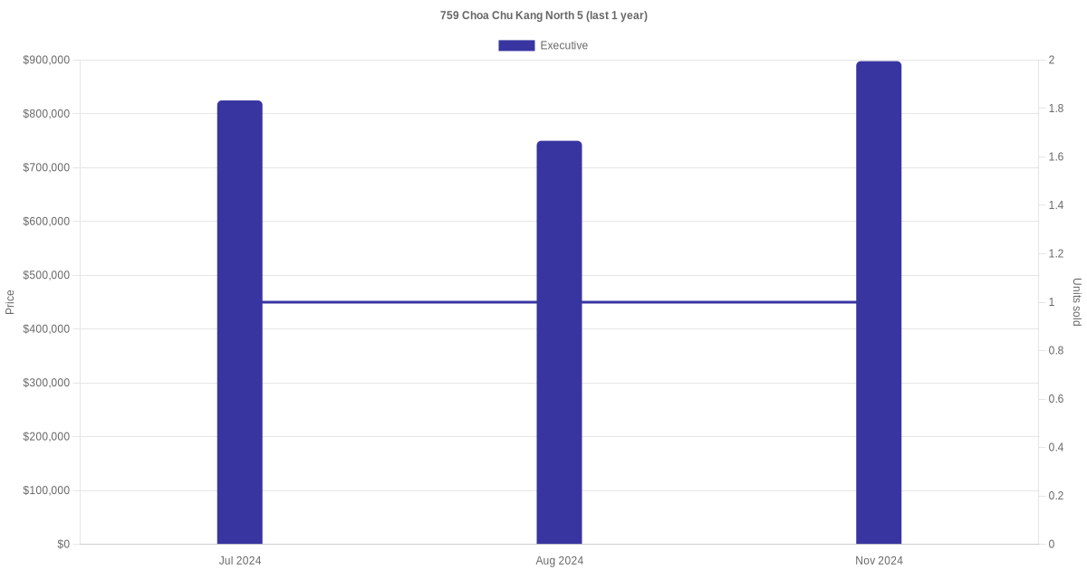 Below is a quick summary of the resale transactions volume and average price trends for the executive units at 759 Choa Chu Kang North 5.
