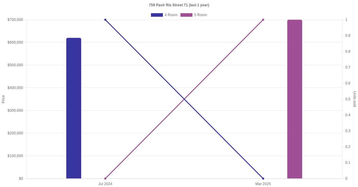 Below is a quick summary of the resale transactions volume and average price trends for the 4 room and 5 room units at 759 Pasir Ris Street 71.