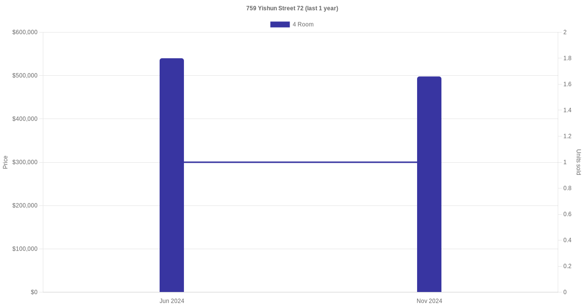 Below is a quick summary of the resale transactions volume and average price trends for the 4 room units at 759 Yishun Street 72.
