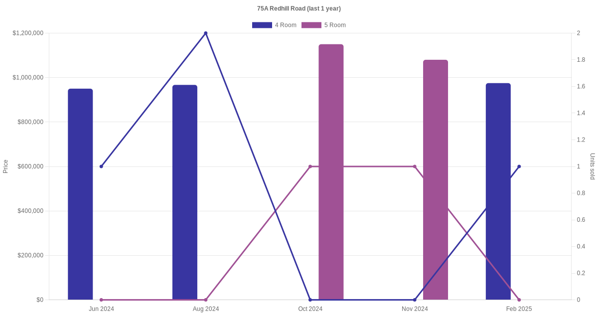 Below is a quick summary of the resale transactions volume and average price trends for the 4 room and 5 room units at 75A Redhill Road.