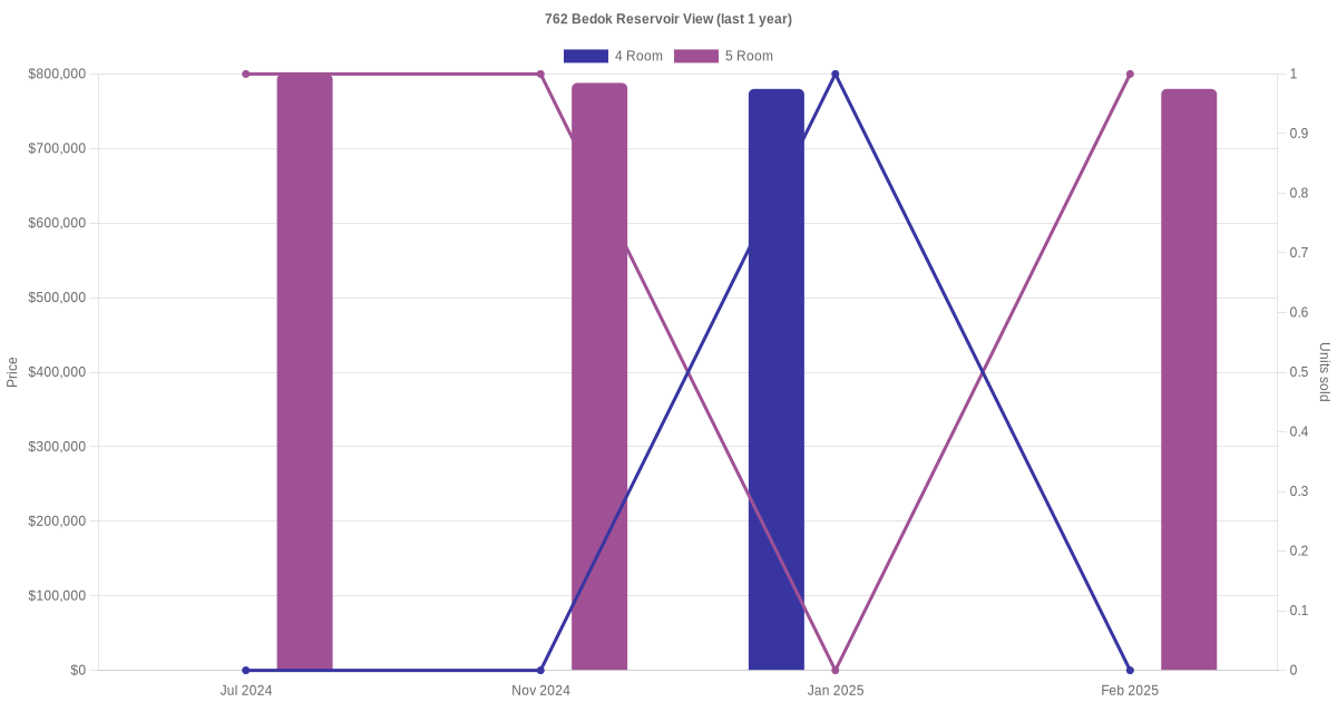 Below is a quick summary of the resale transactions volume and average price trends for the 4 room and 5 room units at 762 Bedok Reservoir View.