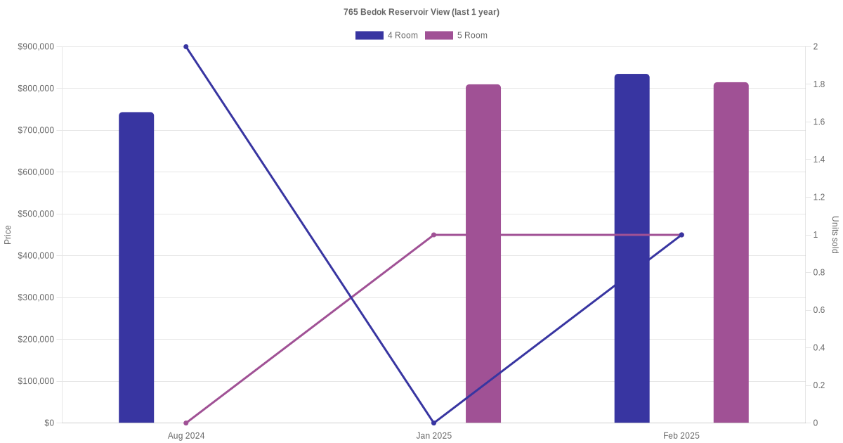 Below is a quick summary of the resale transactions volume and average price trends for the 4 room and 5 room units at 765 Bedok Reservoir View.