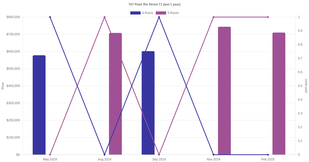 Below is a quick summary of the resale transactions volume and average price trends for the 4 room and 5 room units at 767 Pasir Ris Street 71.