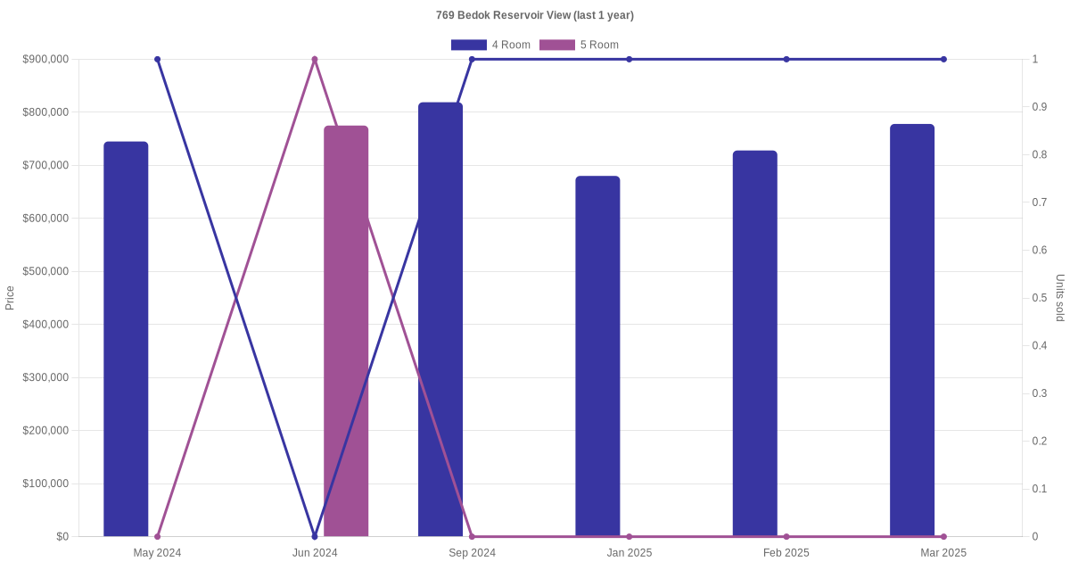Below is a quick summary of the resale transactions volume and average price trends for the 4 room and 5 room units at 769 Bedok Reservoir View.