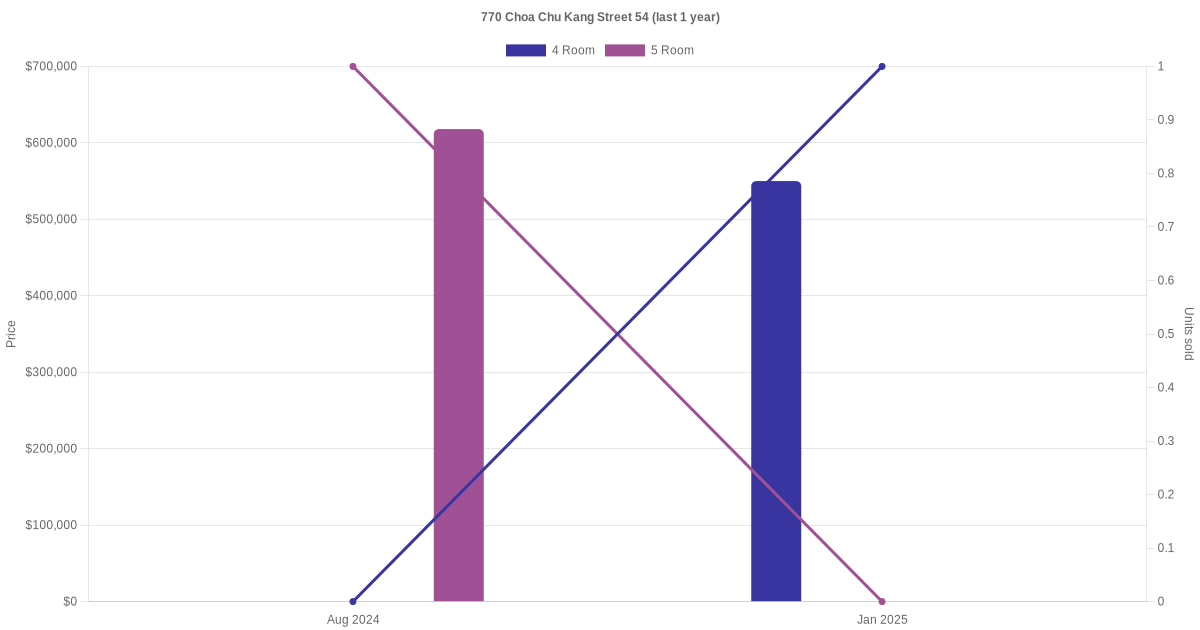 Below is a quick summary of the resale transactions volume and average price trends for the 4 room and 5 room units at 770 Choa Chu Kang Street 54.