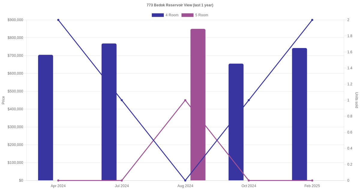 Below is a quick summary of the resale transactions volume and average price trends for the 4 room and 5 room units at 773 Bedok Reservoir View.