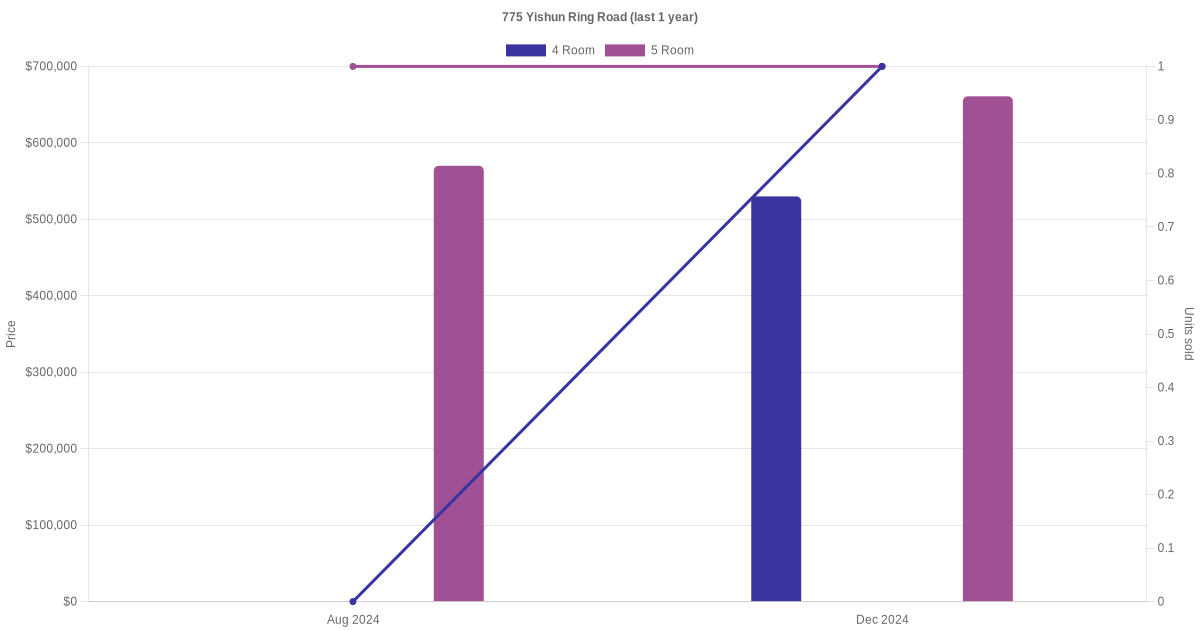 Below is a quick summary of the resale transactions volume and average price trends for the 4 room and 5 room units at 775 Yishun Ring Road.