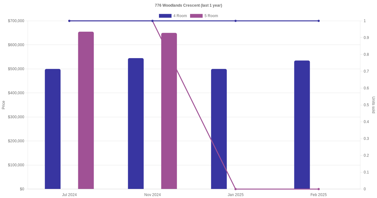 Below is a quick summary of the resale transactions volume and average price trends for the 4 room and 5 room units at 776 Woodlands Crescent.