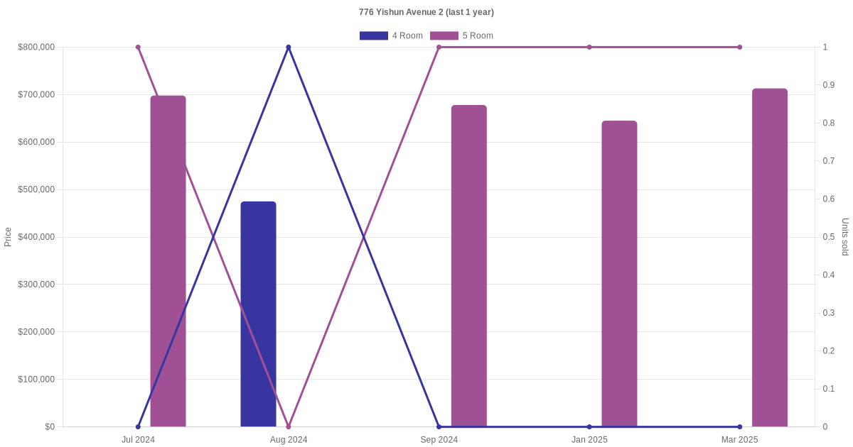 Below is a quick summary of the resale transactions volume and average price trends for the 4 room and 5 room units at 776 Yishun Avenue 2.