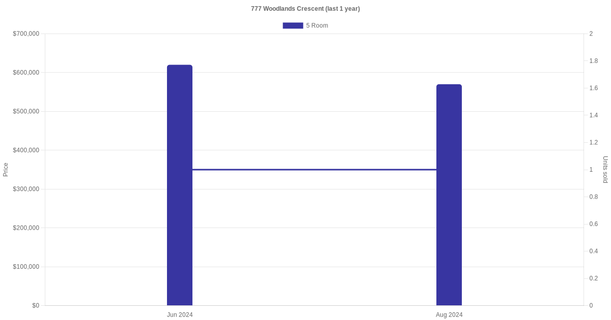 Below is a quick summary of the resale transactions volume and average price trends for the 4 room and 5 room units at 777 Woodlands Crescent.