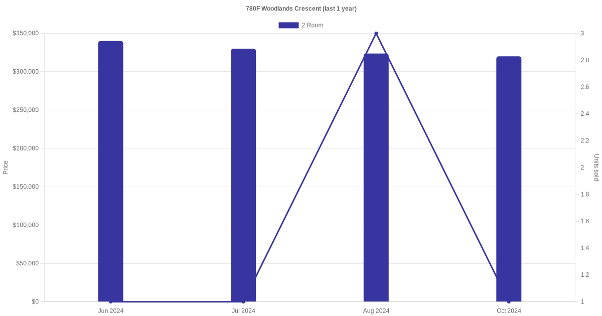 Below is a quick summary of the resale transactions volume and average price trends for the 2 room and 3 room units at 780F Woodlands Crescent.