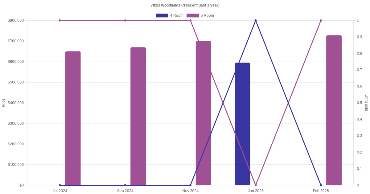 Below is a quick summary of the resale transactions volume and average price trends for the 4 room and 5 room units at 782B Woodlands Crescent.