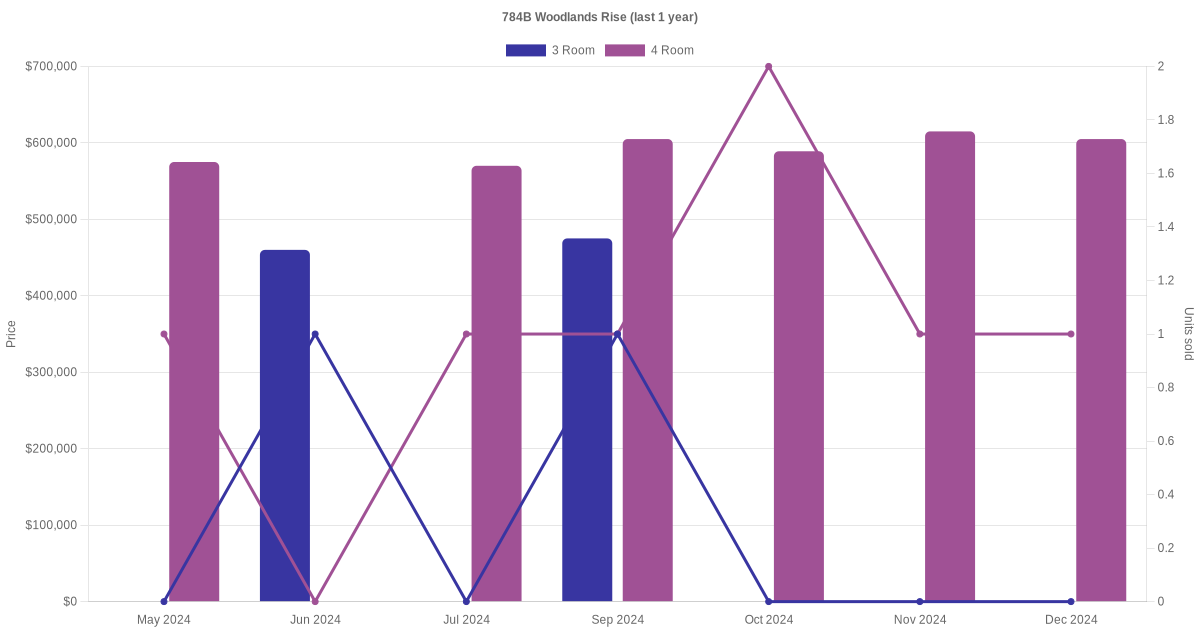 Below is a quick summary of the resale transactions volume and average price trends for the 3 room and 4 room units at 784B Woodlands Rise.