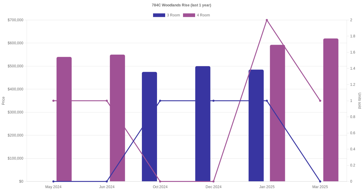 Here's a summary of the rental transactions and price trends for the 3 room and 4 room units at 784C Woodlands Rise.