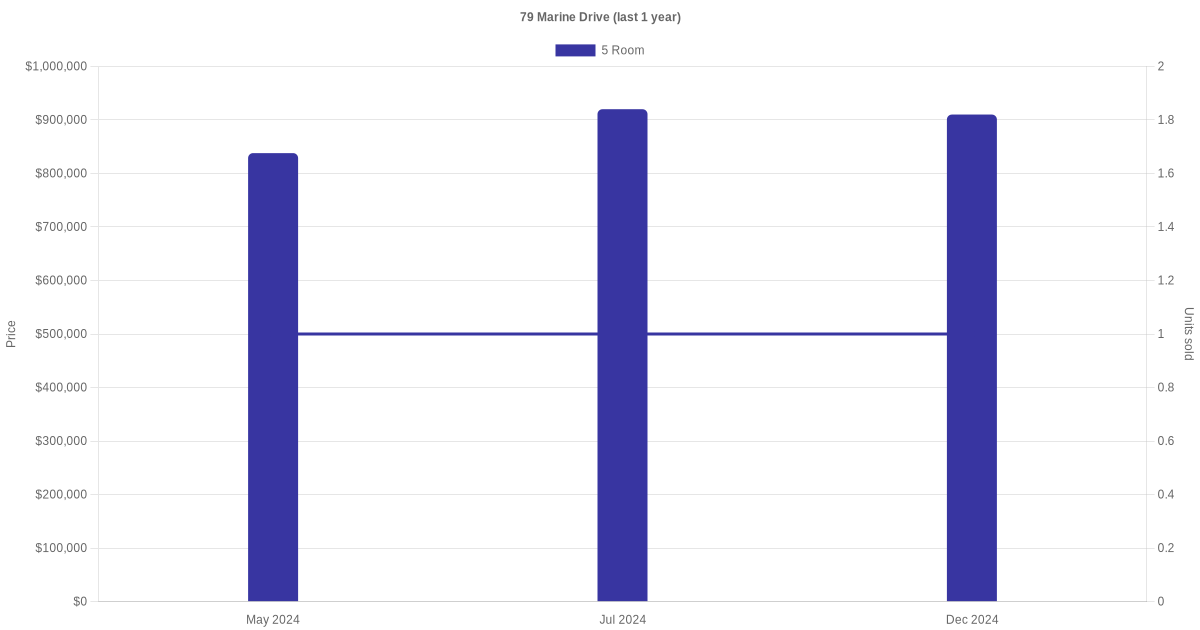 Below is a quick summary of the resale transactions volume and average price trends for the 5 room units at 79 Marine Drive.