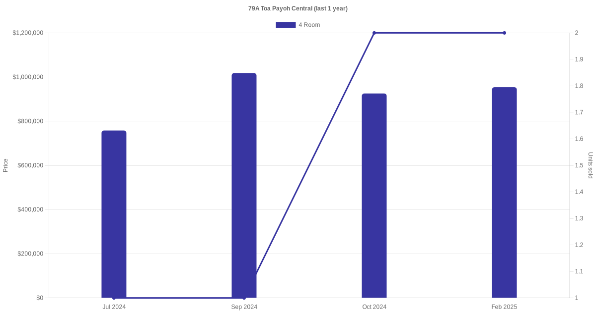 Below is a quick summary of the resale transactions volume and average price trends for the 4 room units at 79A Toa Payoh Central.